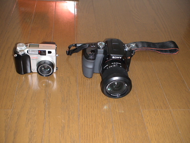 見た目キャノンが一回り小さく見えるがコンパクトカメラと比べるとどちらもでかくて重い!