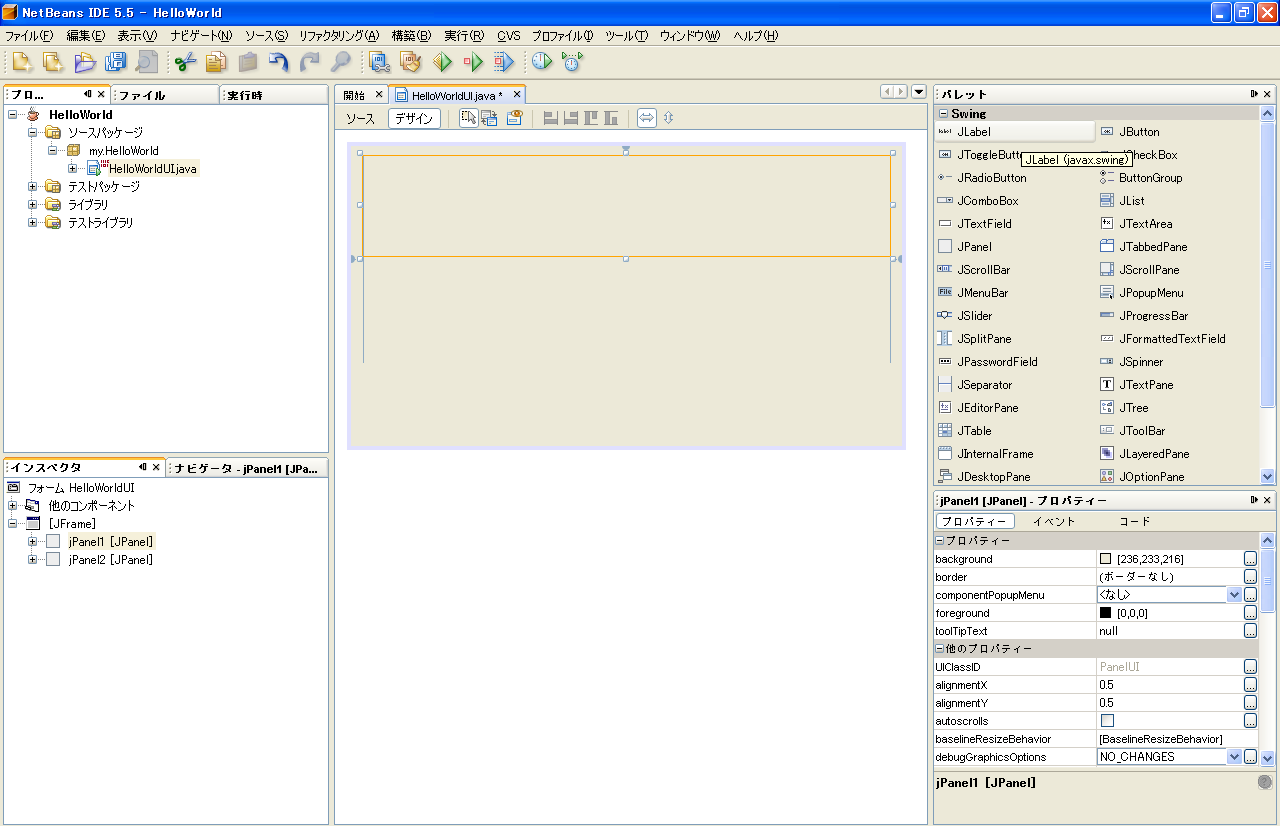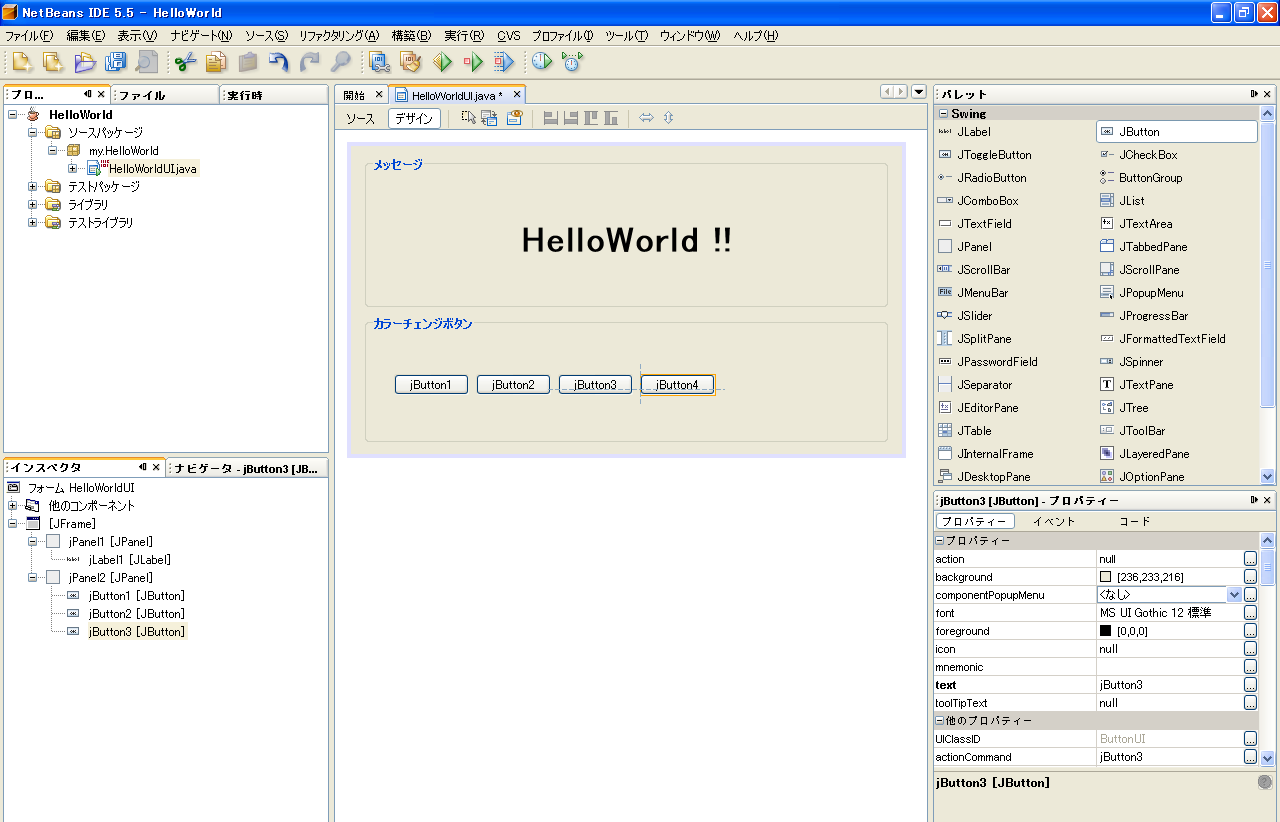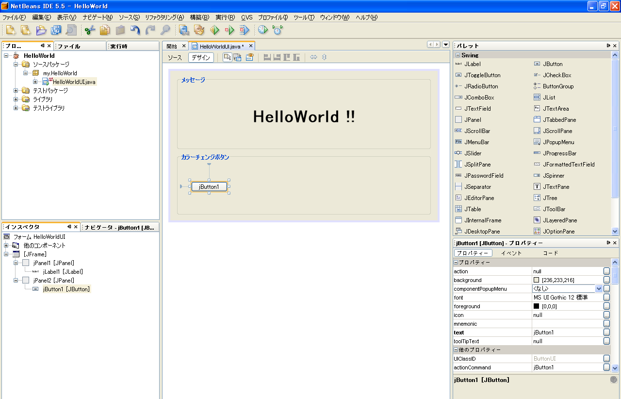 JPanel同様にパレットからSwingのJButtonをドラッグ&ドロップで装備します。