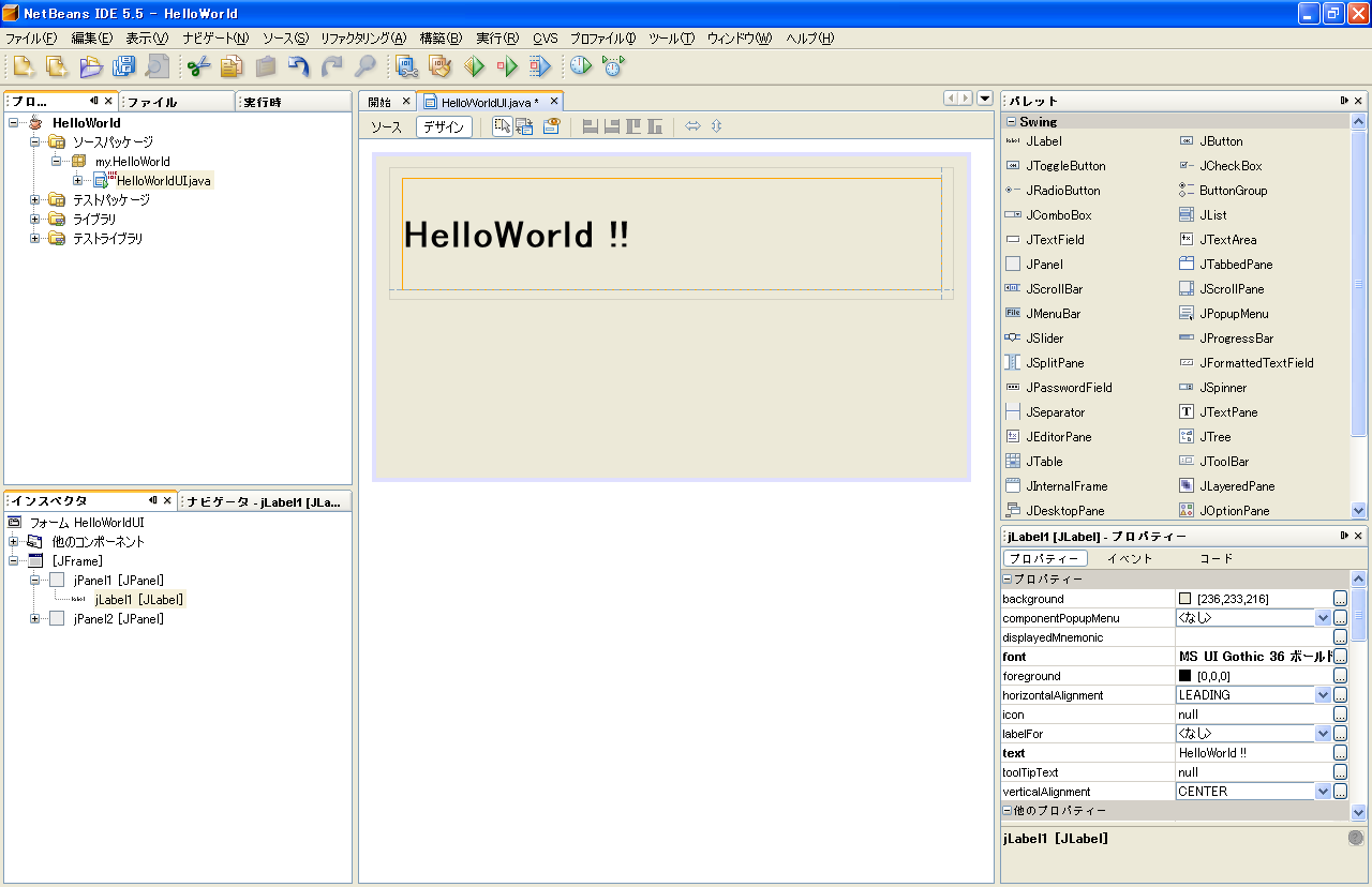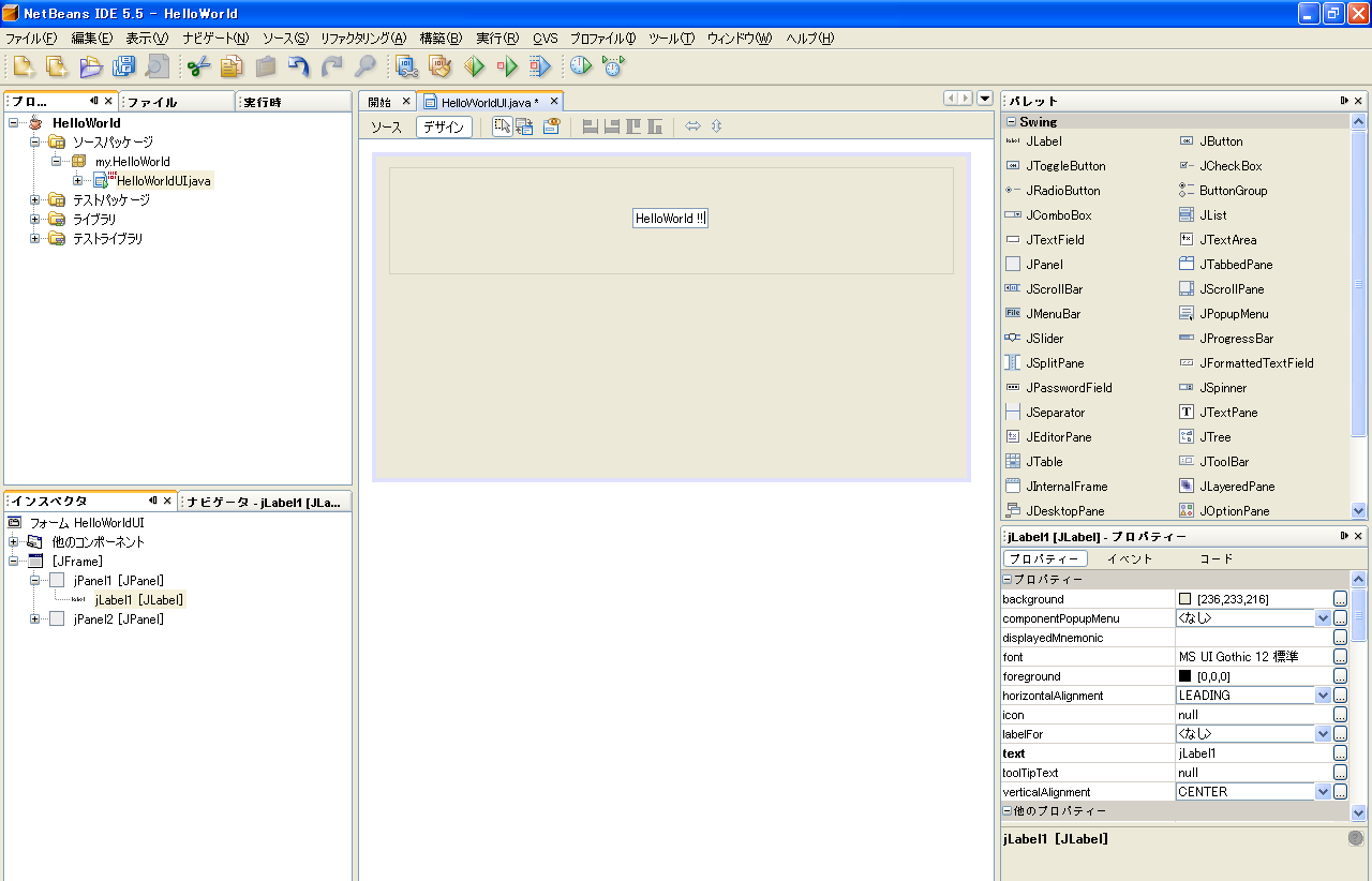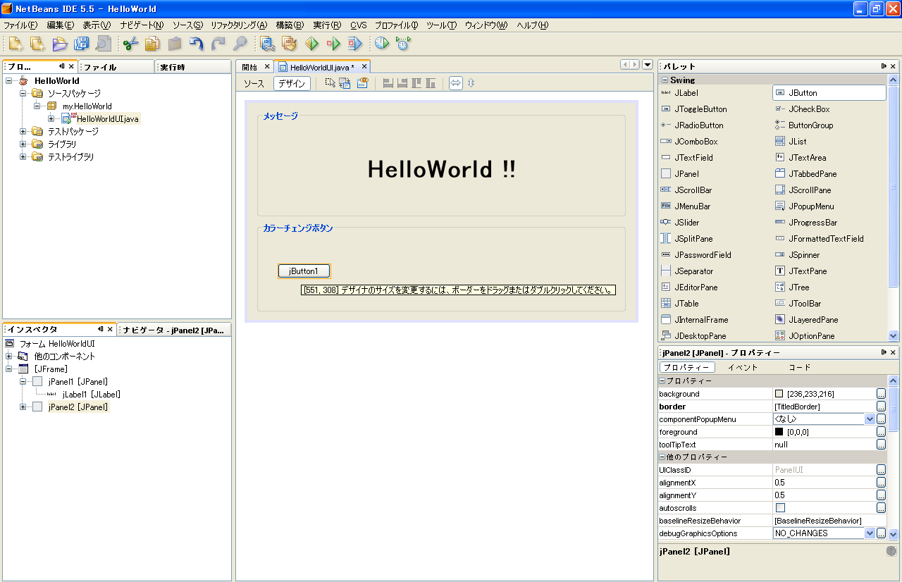 JPanel同様にパレットからSwingのJButtonをドラッグ&ドロップで装備します。
