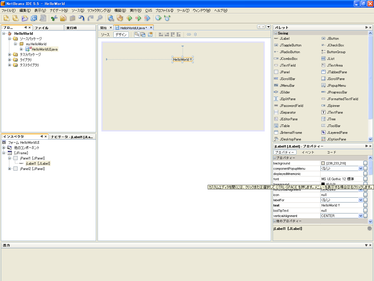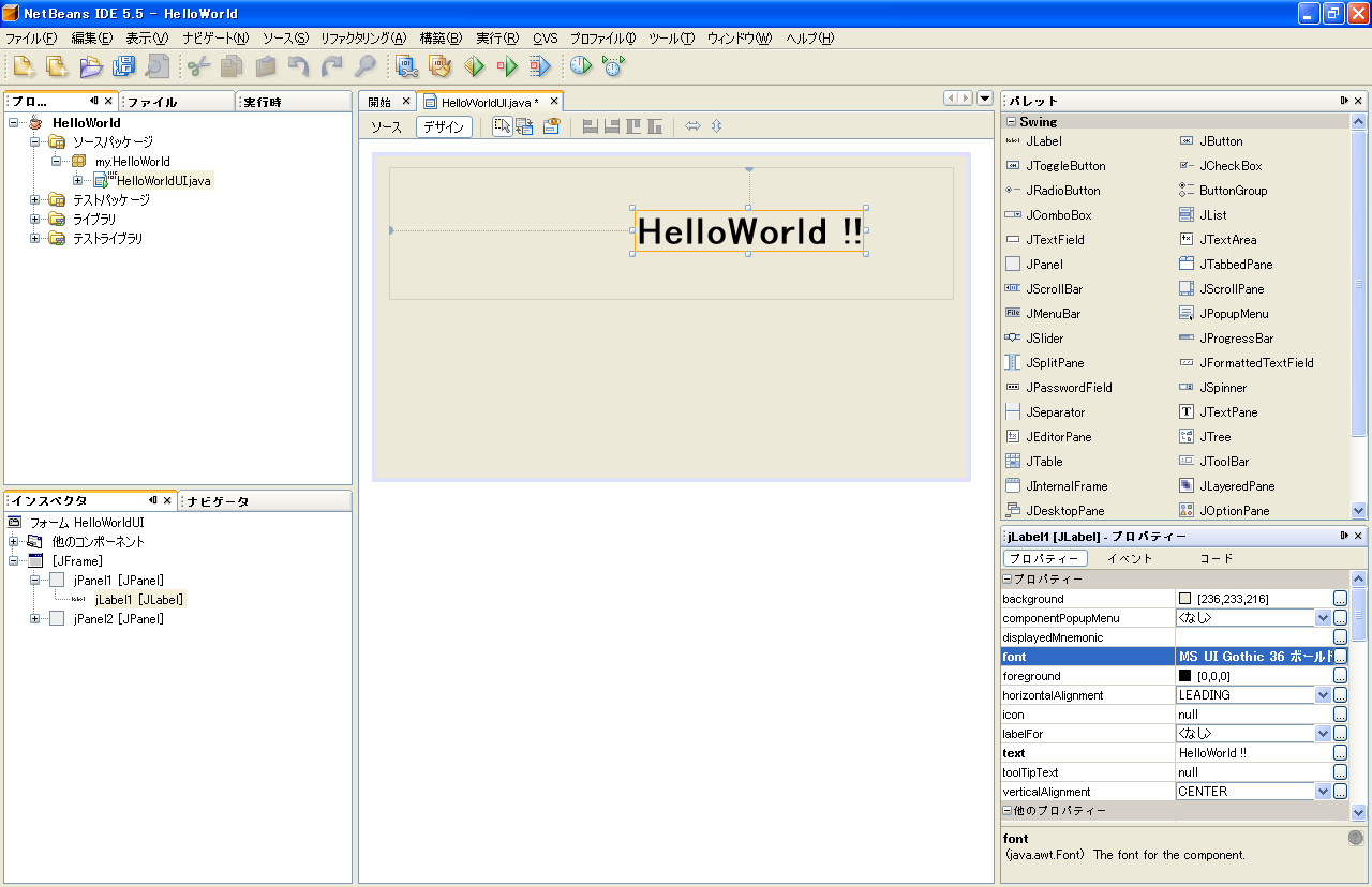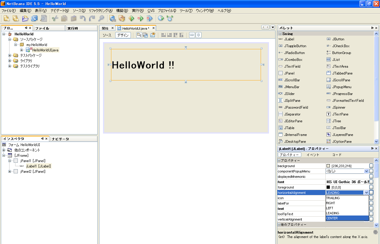 jLabel1 のプロパティの設定を変更しフォントをラベルのセンターに表示するようにします。