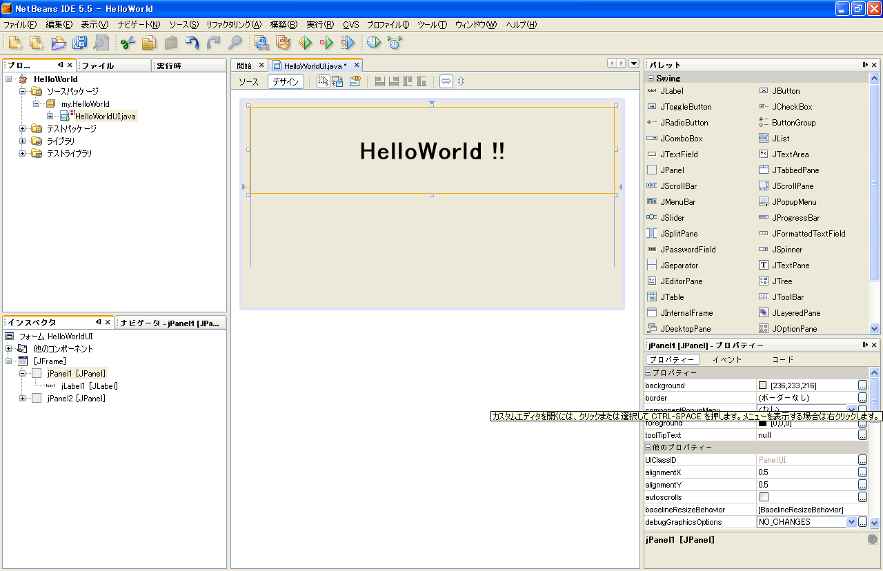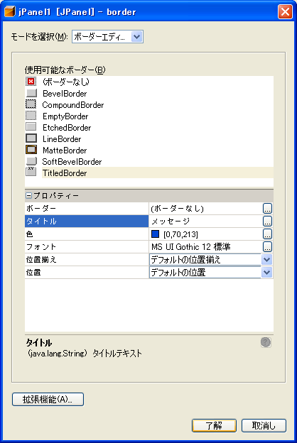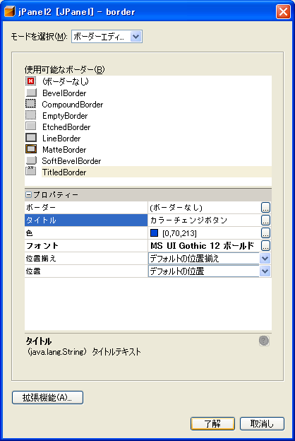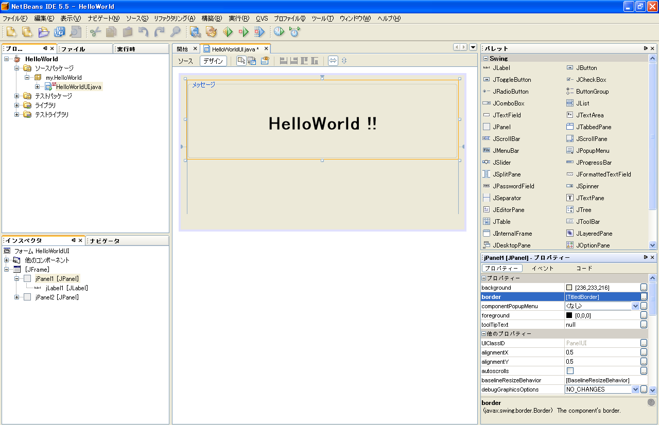 jPanel1 のプロパティで border の右端のボタンをクリックしてプロパティエディタを出します。