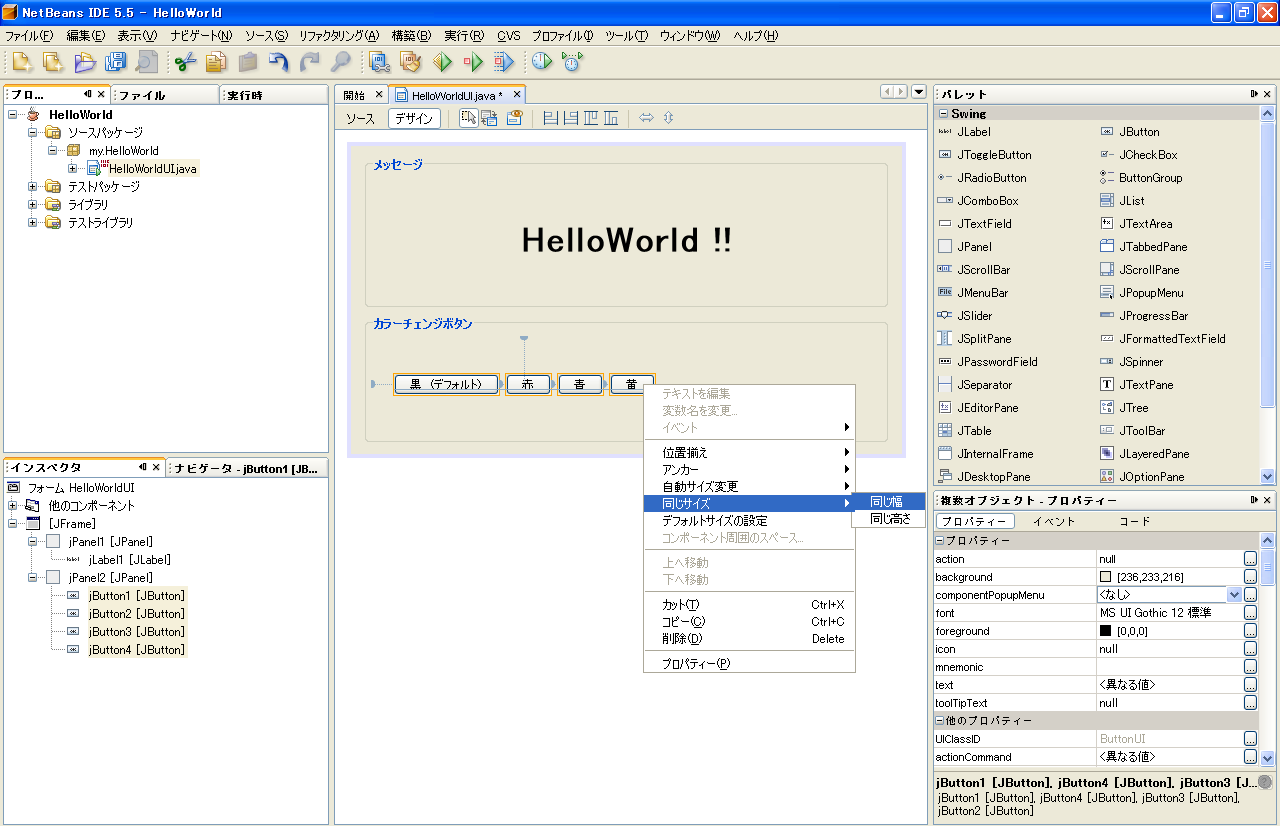 JButtonを4個選択した状態でどれか一つを右クリックします。