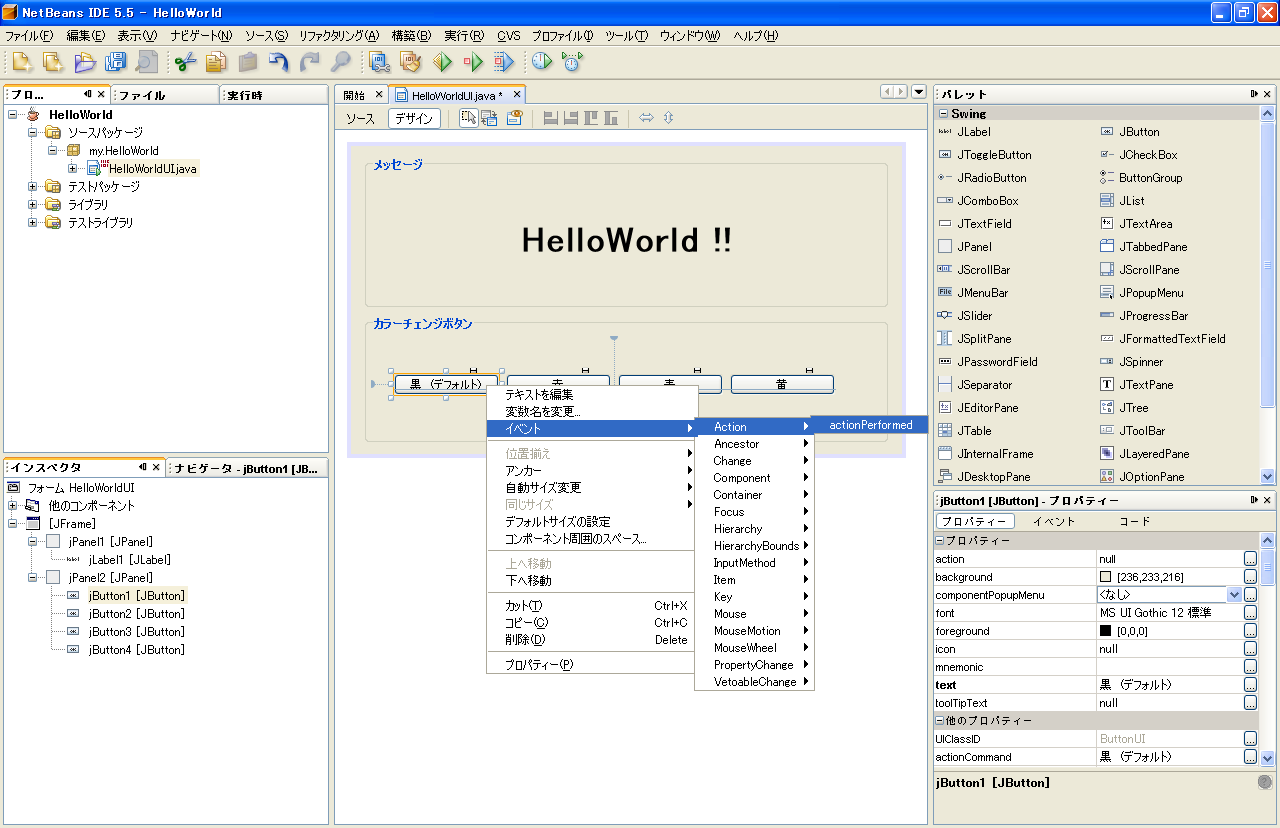 JButtonを選択し、右クリックでポップアップメニューを表示させます。