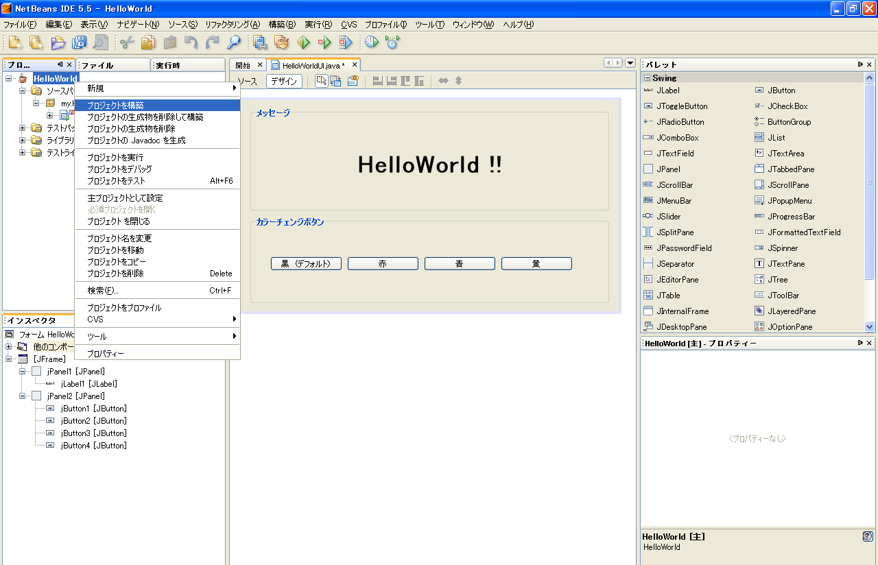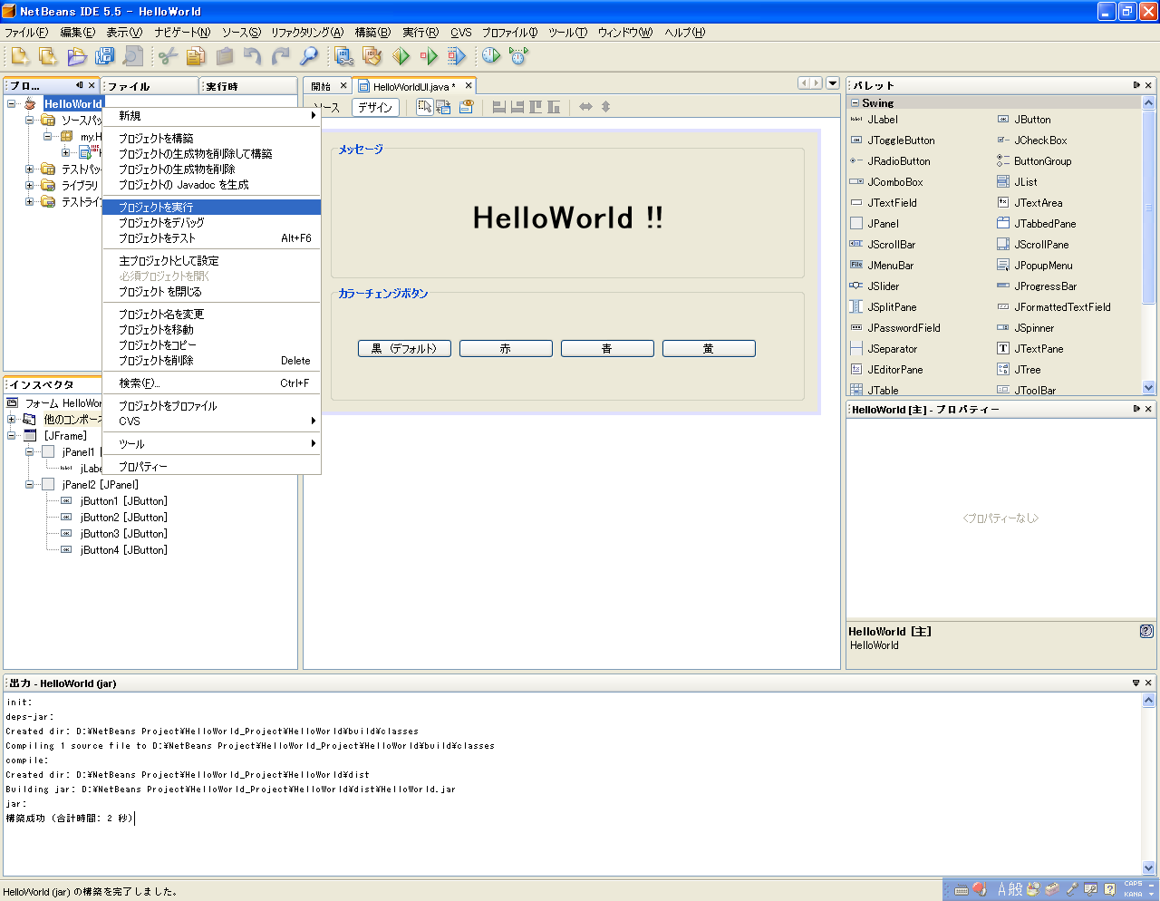 プロジェクトウィンドウの「HelloWorld」を右クリックし、プロジェクトを構築を選択します。
