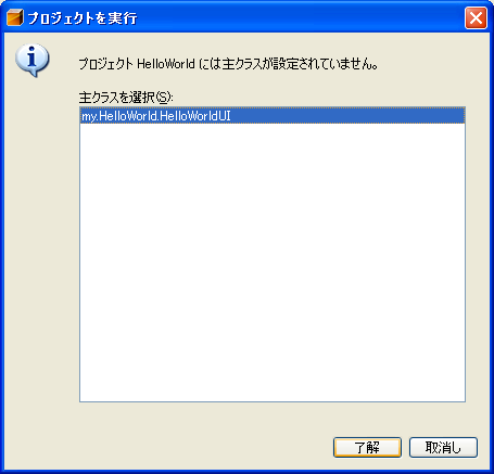 すると、プロジェクトを作るときに主クラスを作成してないのでこのようなメッセージのダイアログが表示されます。