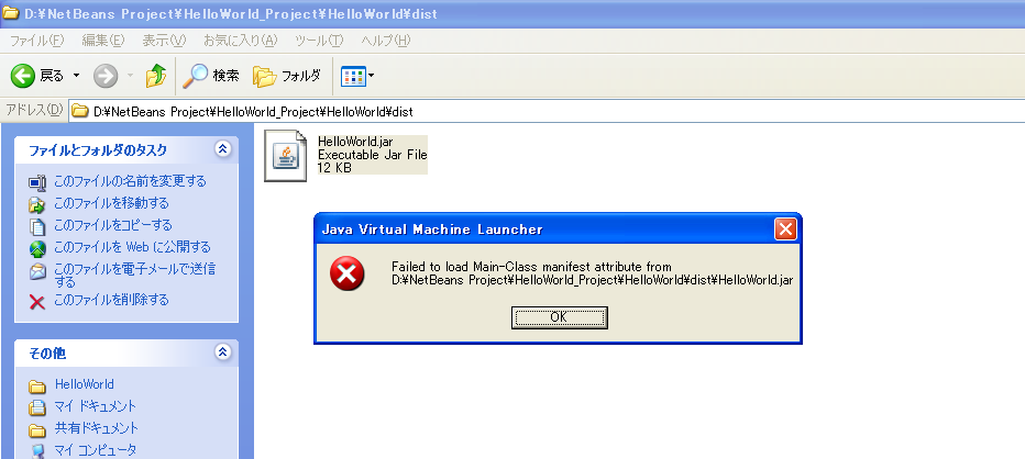ここで注意が必要なのはさっき実行時にダイアログで主クラスを設定した場合はまだ実行可能JARファイルになってません。