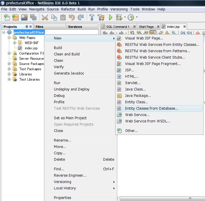 さっき作った prefecturalOffice プロジェクトを右クリックし、[ New ] → [ Entity Classes from Database... ] を選択します。