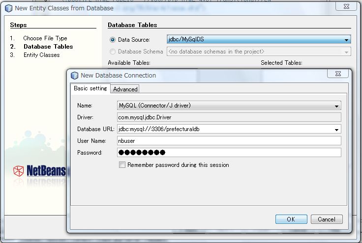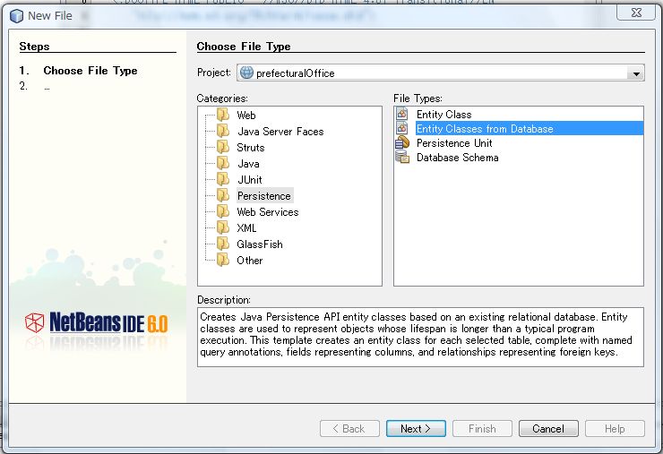 [ Persistence ] → [ Entity Classes from Database ] そして [ Next > ] ボタンを押します。