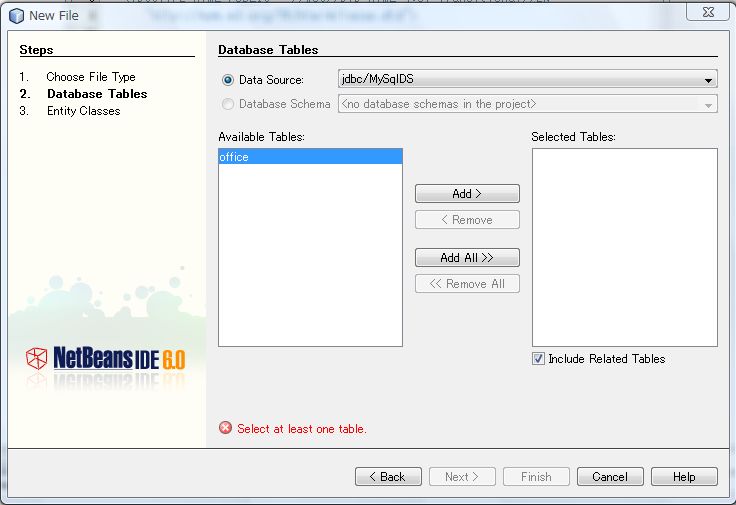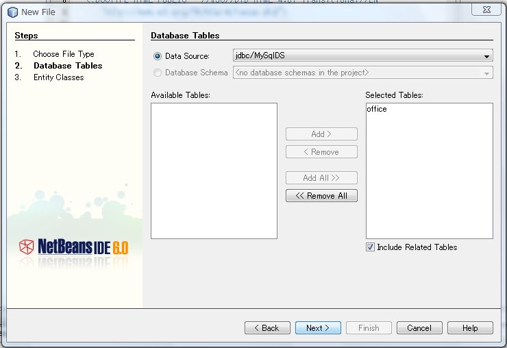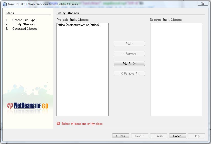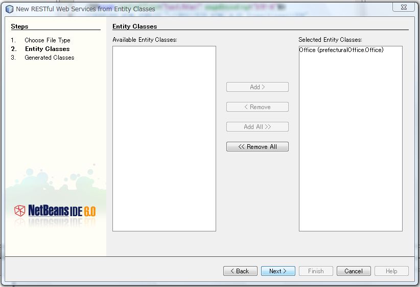 左の利用可能なエンティティクラスから Office を選んで右の Selected Entity Classes へ [ Add > ] ボタンを押して移動させます。