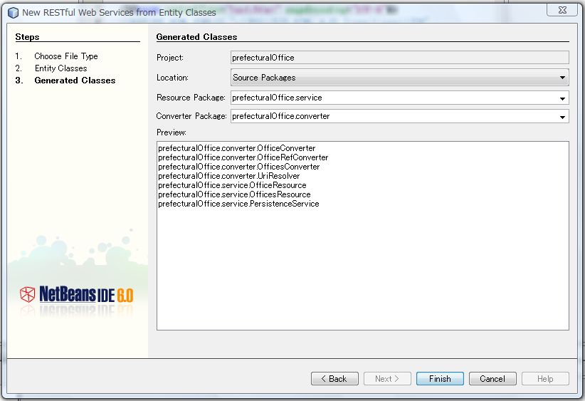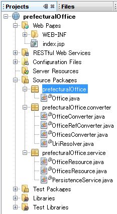 prefecturalOffic.converter パッケージと prefecturalOffice.servise パッケージ以下が自動生成されているのがプロジェクトノードツリーで確認できます。