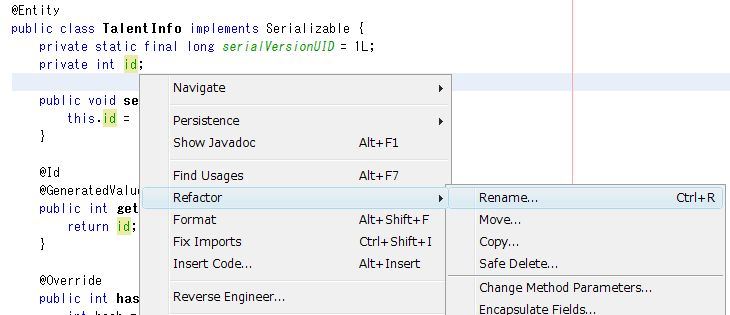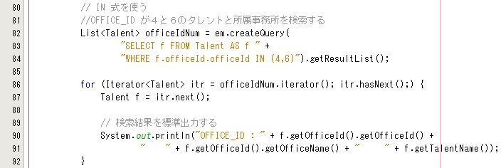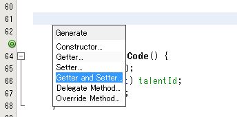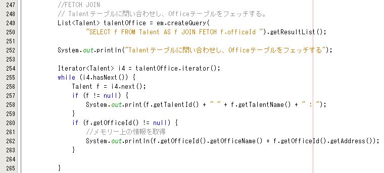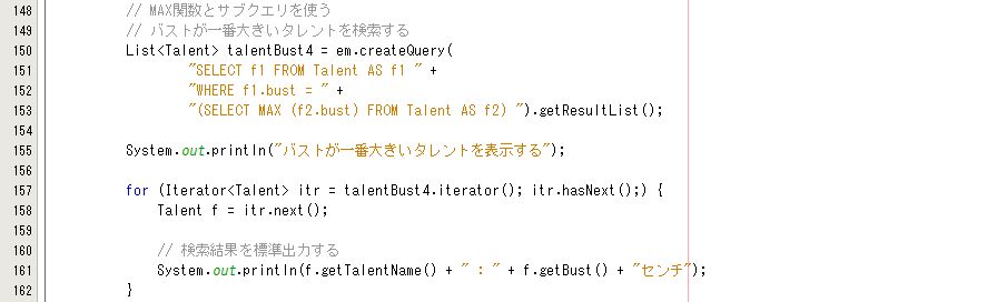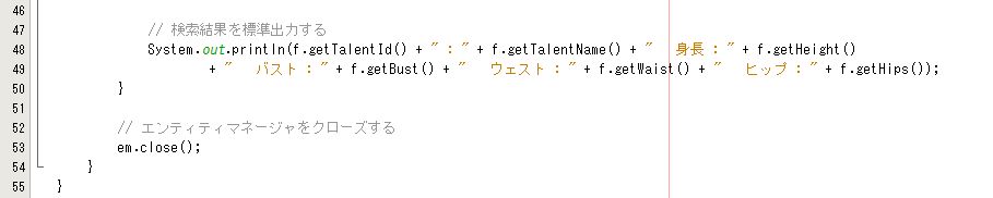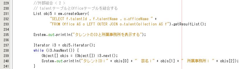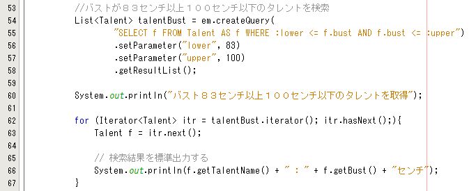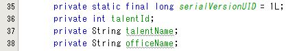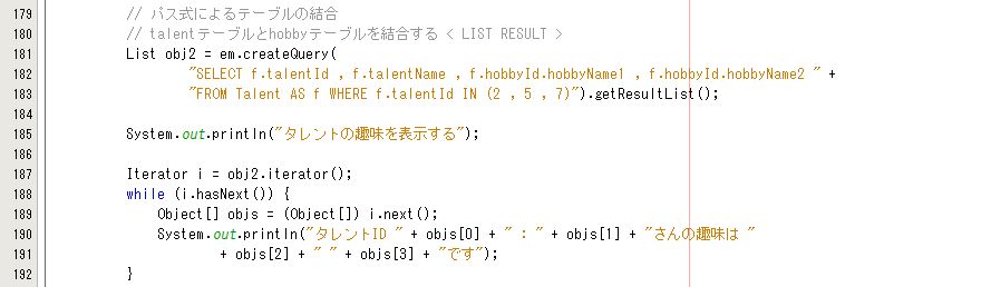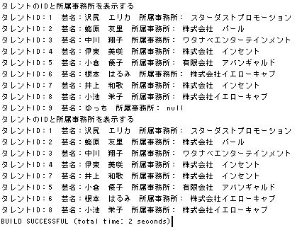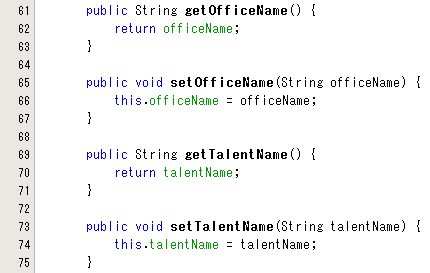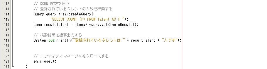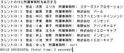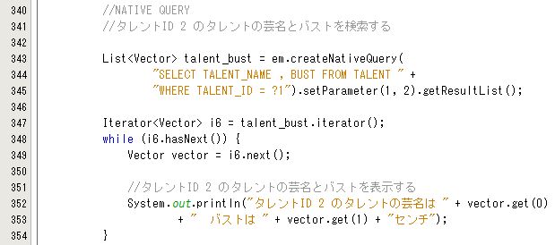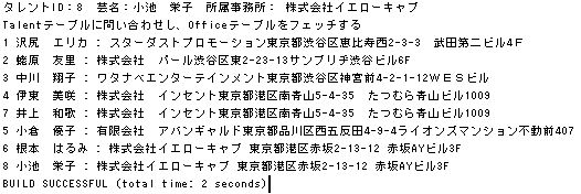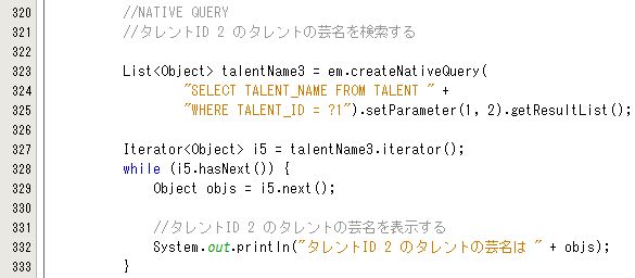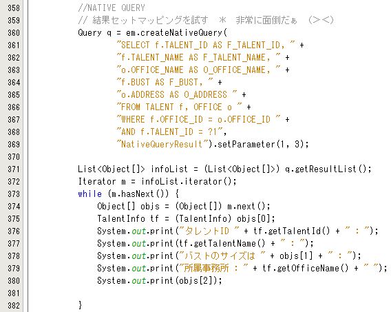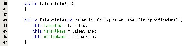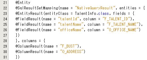 このように面倒な手作業によるマッピングをすることによって、ネイティブクエリで指定したカラム値をエンティティクラス(TalentInfo クラス)のフィールドに格納した形で受け取ることができます。