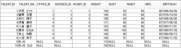 タレントID 3 の TALENT_ID , TALENT_NAME , OFFICE_NAME , BUST , ADDRESS を抽出します。