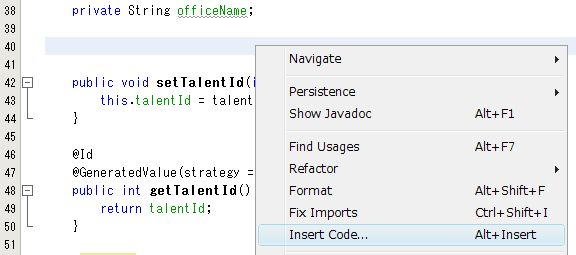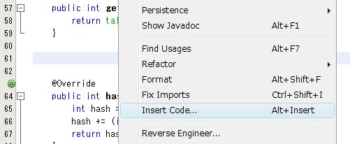 エディタでコンストラクタと入れたい所で右クリックして、[ Insert Code... ] をクリックします。