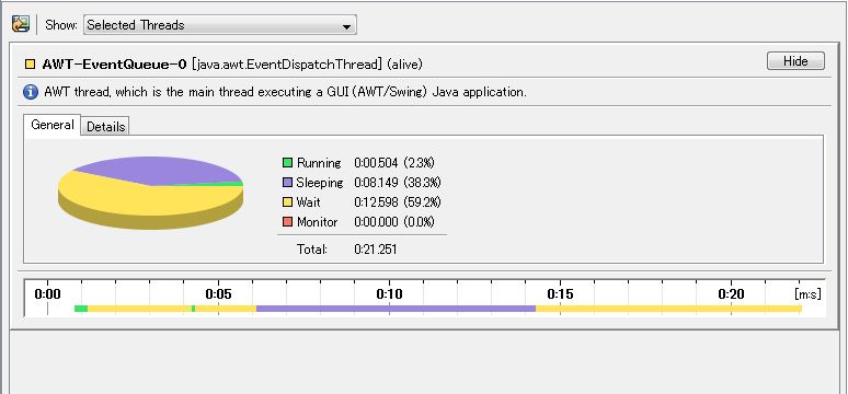 このプロファイラを使うことによってイベントディスパッチスレッド上で本来してはいけない長い処理をしているのが確認できます。