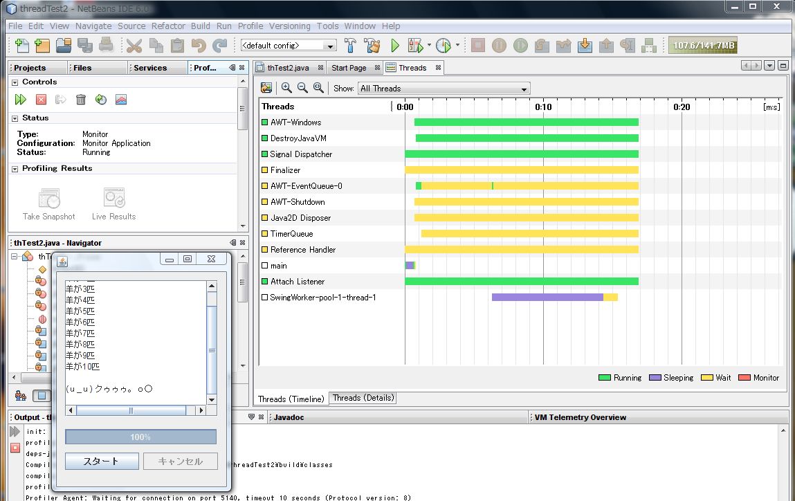 そこで、NetBeans6.0 に搭載されている高機能なプロファイラを使ってスレッドの状態を確認してみます。