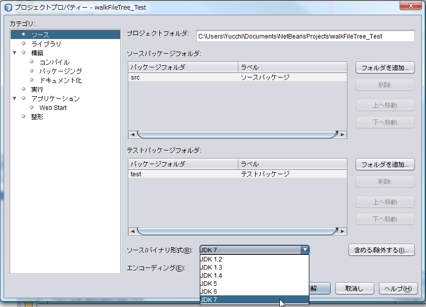[ ソース ] カテゴリの下のほうにある [ ソース / バイナリ形式 ] のドロップダウンリストから JDK 7 を選択し、[ 了解 ] ボタンを押します。
