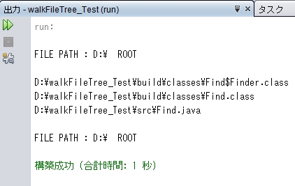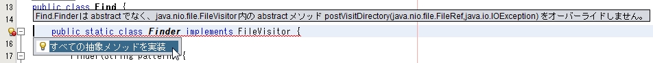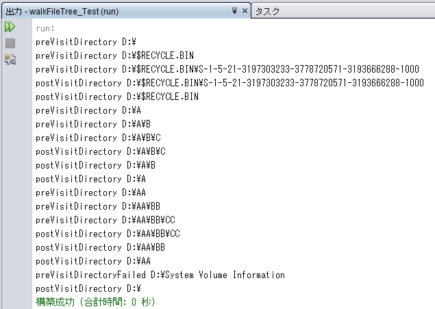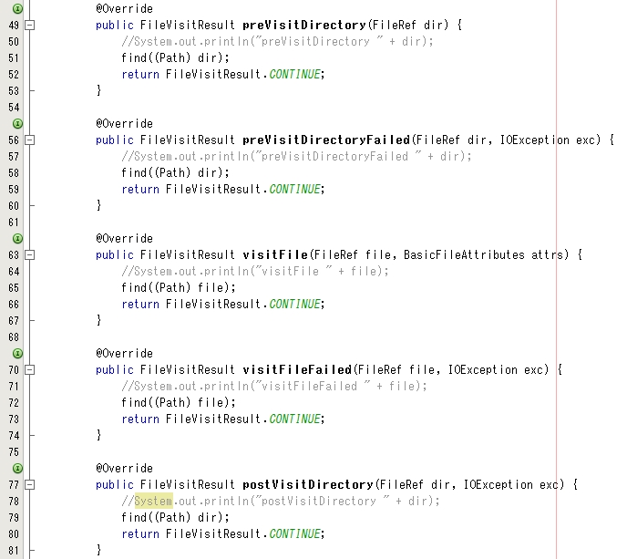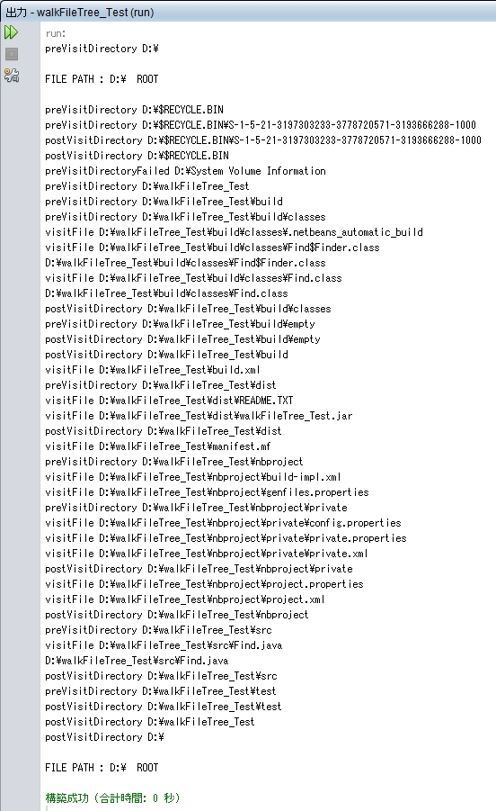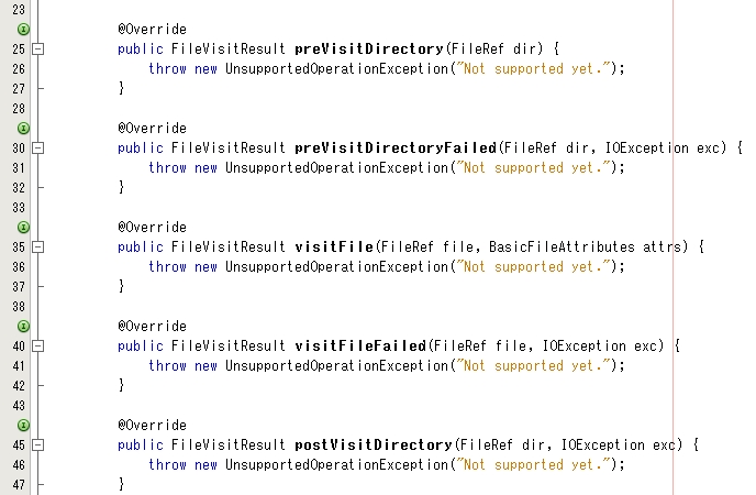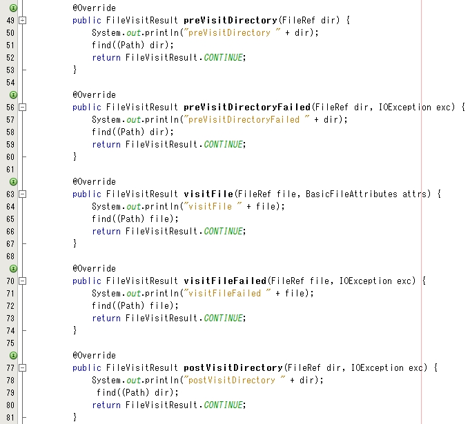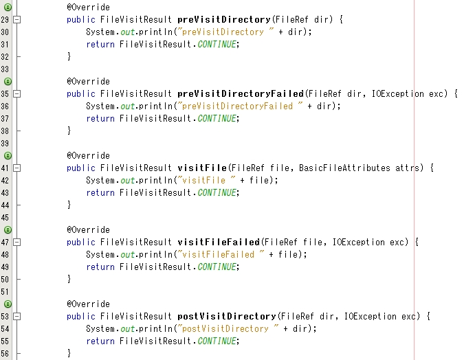 無事に FileVisitor インターフェイスの抽象メソッドをすべて実装しました。