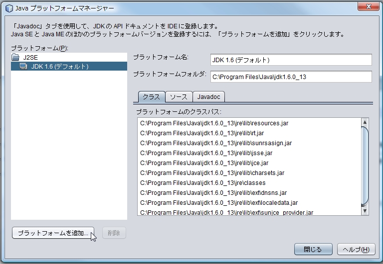 [ Java プラットフォームマネージャー ] ウィンドウが表示されますので左下の [ プラットフォームを追加 ... ] ボタンを押します。