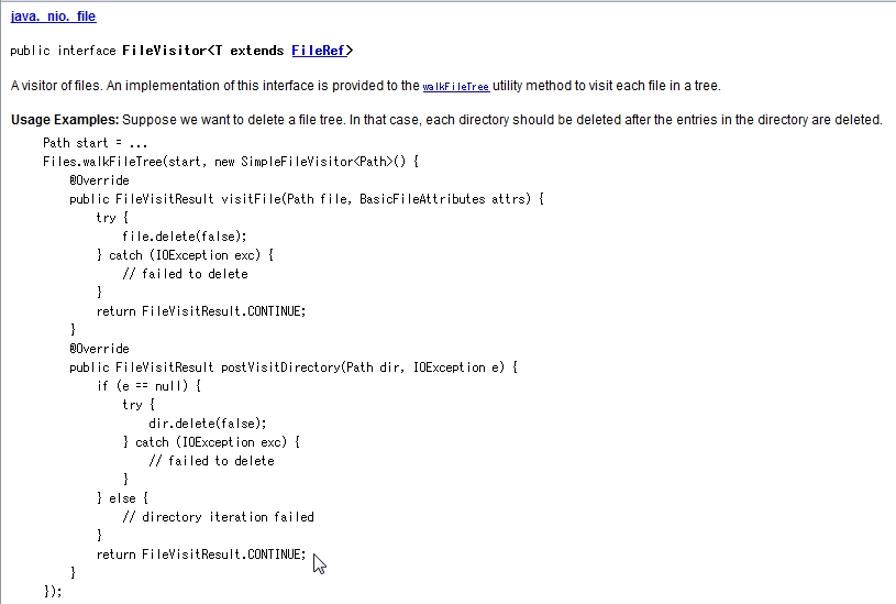 それでは FileVisitor インターフェイスに実装されている下記の五つの抽象メソッドをオーバーライドします。
