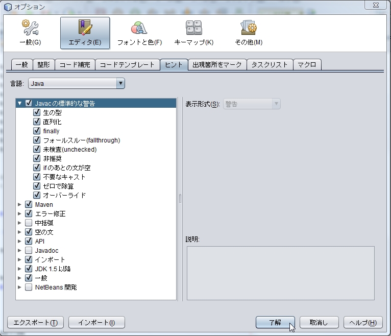 下図のように [ Javac の標準的な警告 ] のチェックを入れます。