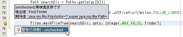 75 行目にヒントが表示され「警告の抑制 - unchecked」が出ますのでそれをクリックします。