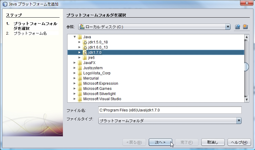 JDK 7 build 58 のインストールディレクトリを指定して [ 次へ > ] ボタンを押します。