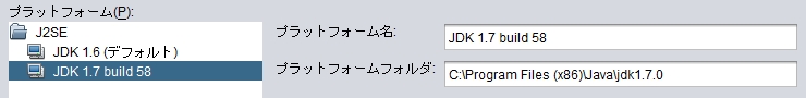 [ Java プラットフォーム ] に先ほど登録した JDK 7 build 58 をドロップダウンリストから選択します。