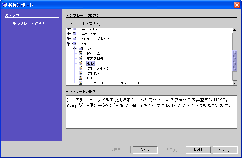 新規ウィザード画面より RMI - Hello テンプレートを選択くします。