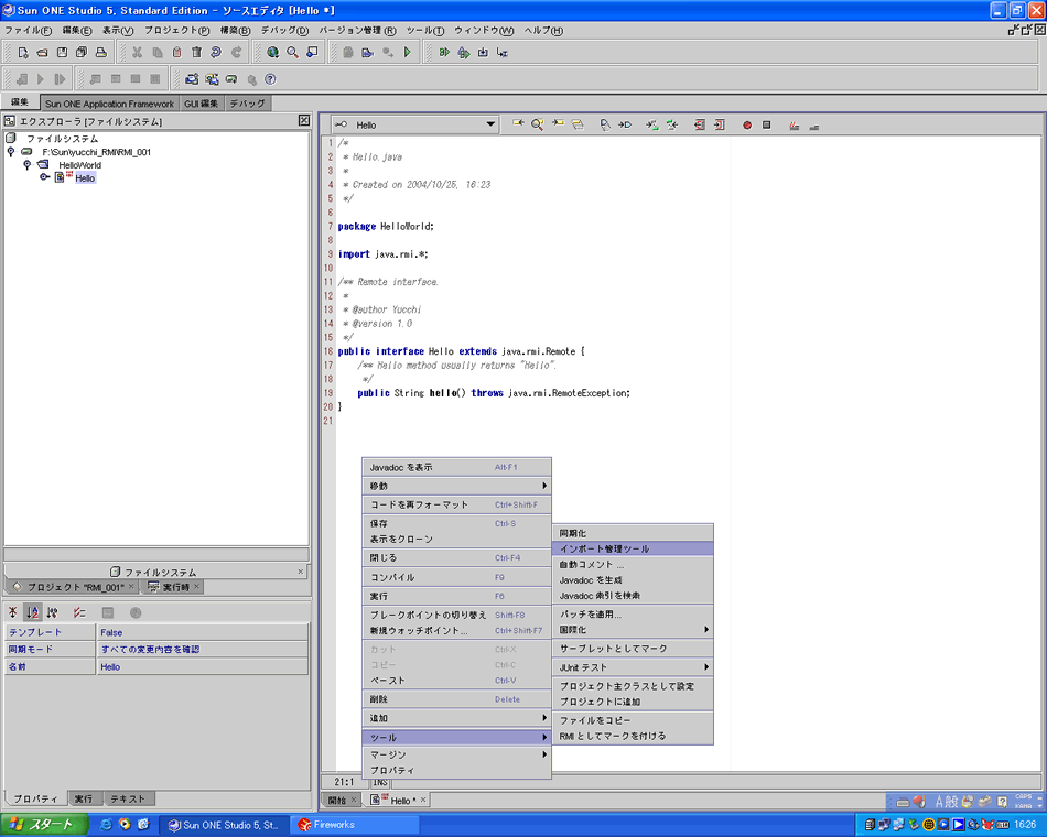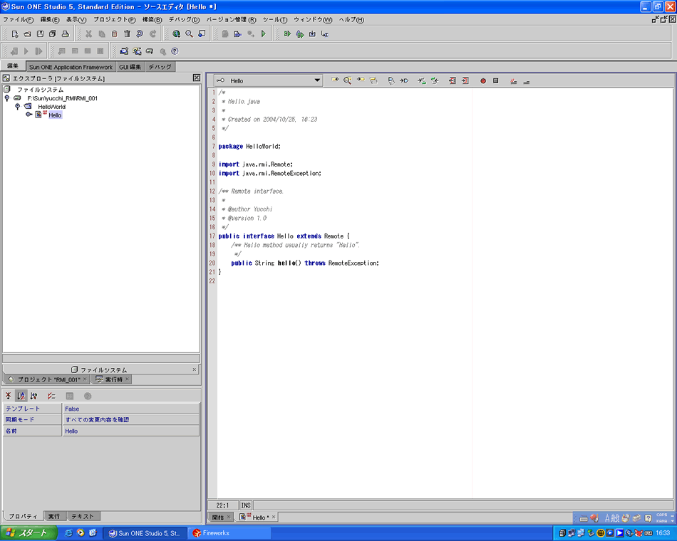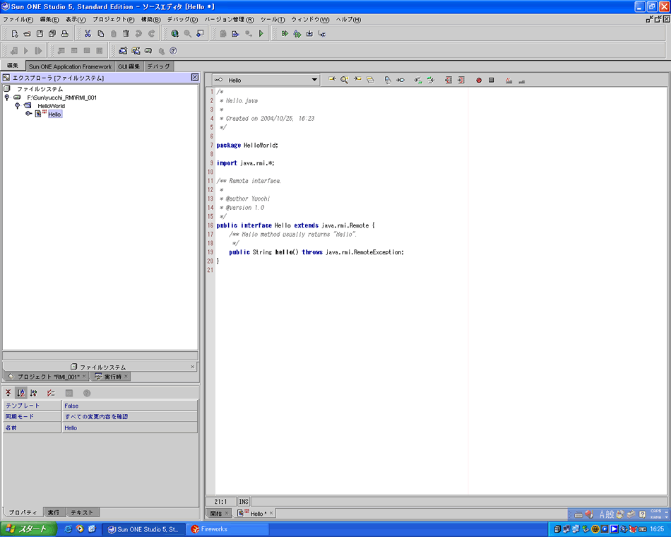 HelloWold パッケージにリモートインタフェースの Hello インタフェースがファイルシステムに生成されました。