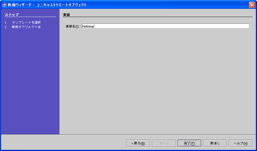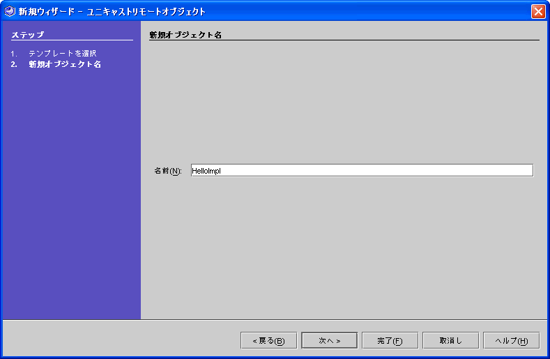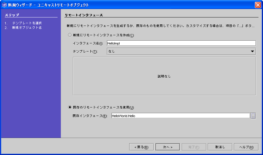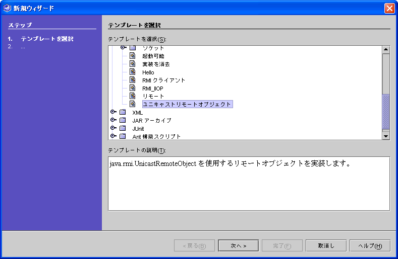 [ 新規ウィザード ] のRMIテンプレートノードよりユニキャストリモートオブジェクトを選択します。