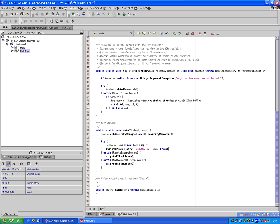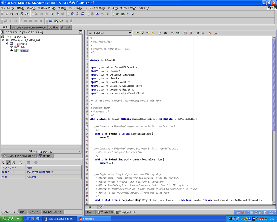 このままでもいいのですが、RMIレジストリのバインド名を HelloImpl から HelloServer に変更します。(66行)